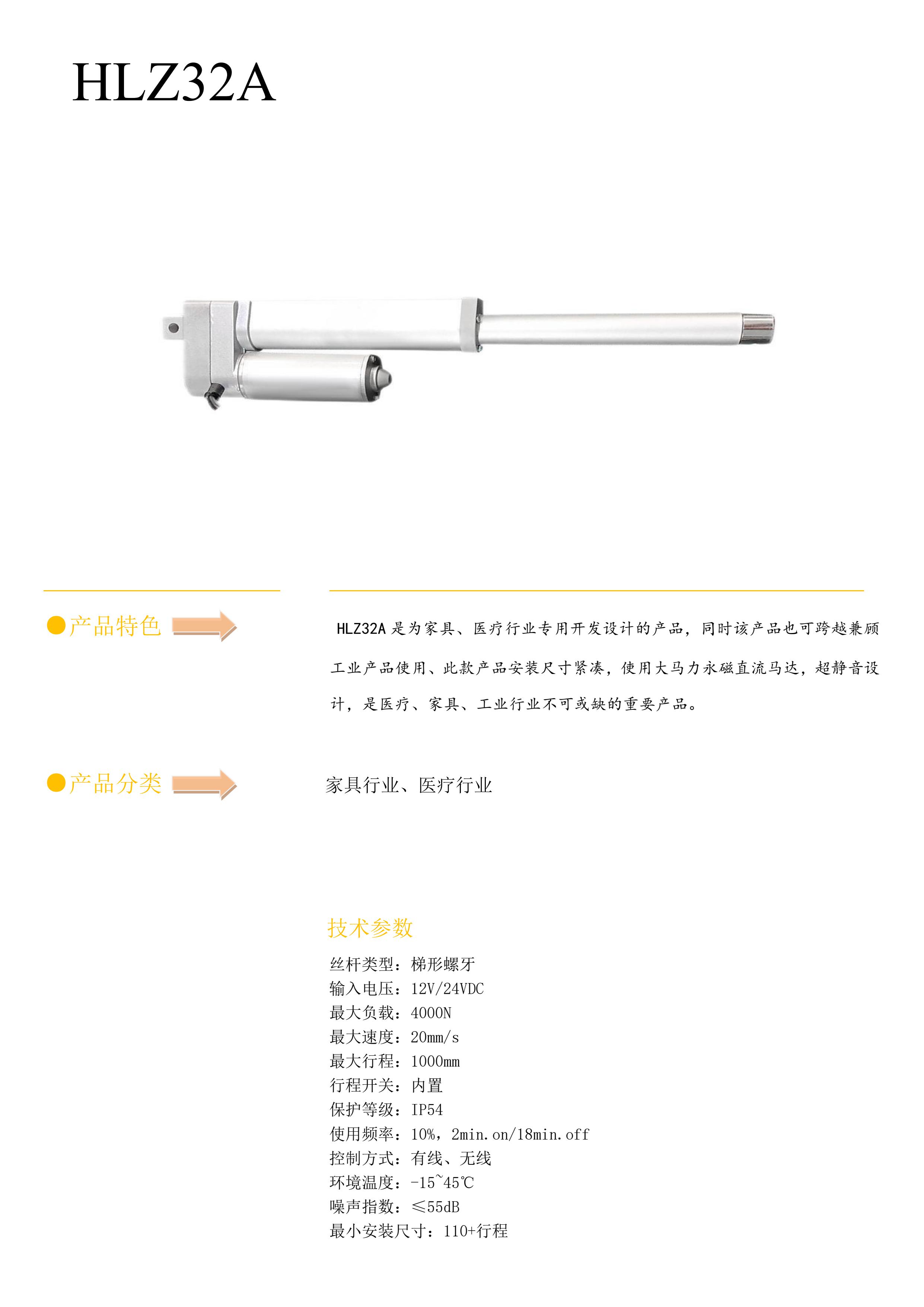HLZ32A是为家具、医疗行业专用开发设计的产品,同时该产品也可跨越兼顾工业产品使用、此款产品安装尺寸紧凑,使用大马力永磁直流马达,超静音设计,是医疗、家具、工业行业不可或缺的重要产品。