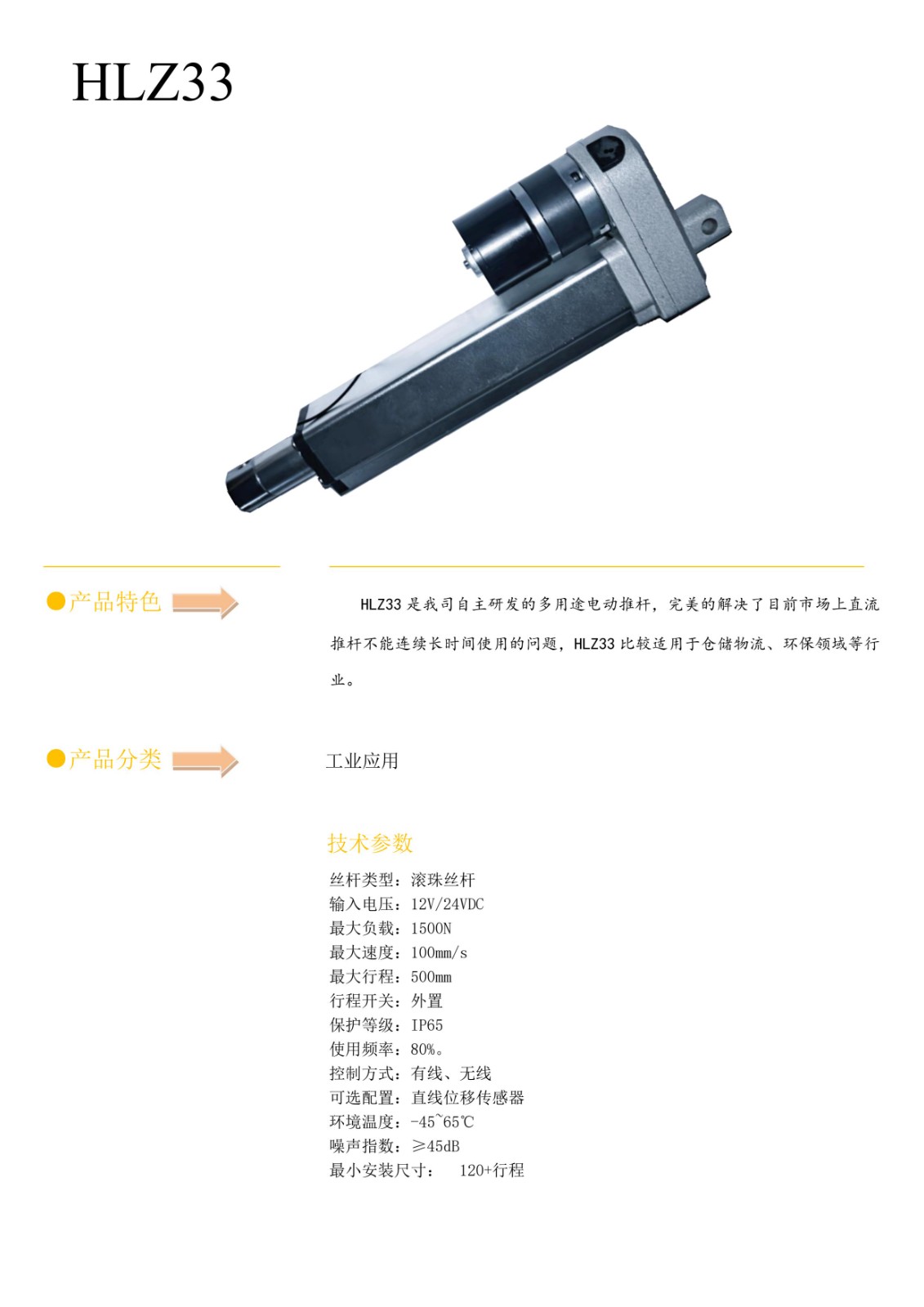 HLZ33是我司自主研发的多用途电动推杆,完美的解决了目前市场上直流推杆不能连续长时间使用的问题,HLZ33比较适用于仓储物流、环保领域等行业。