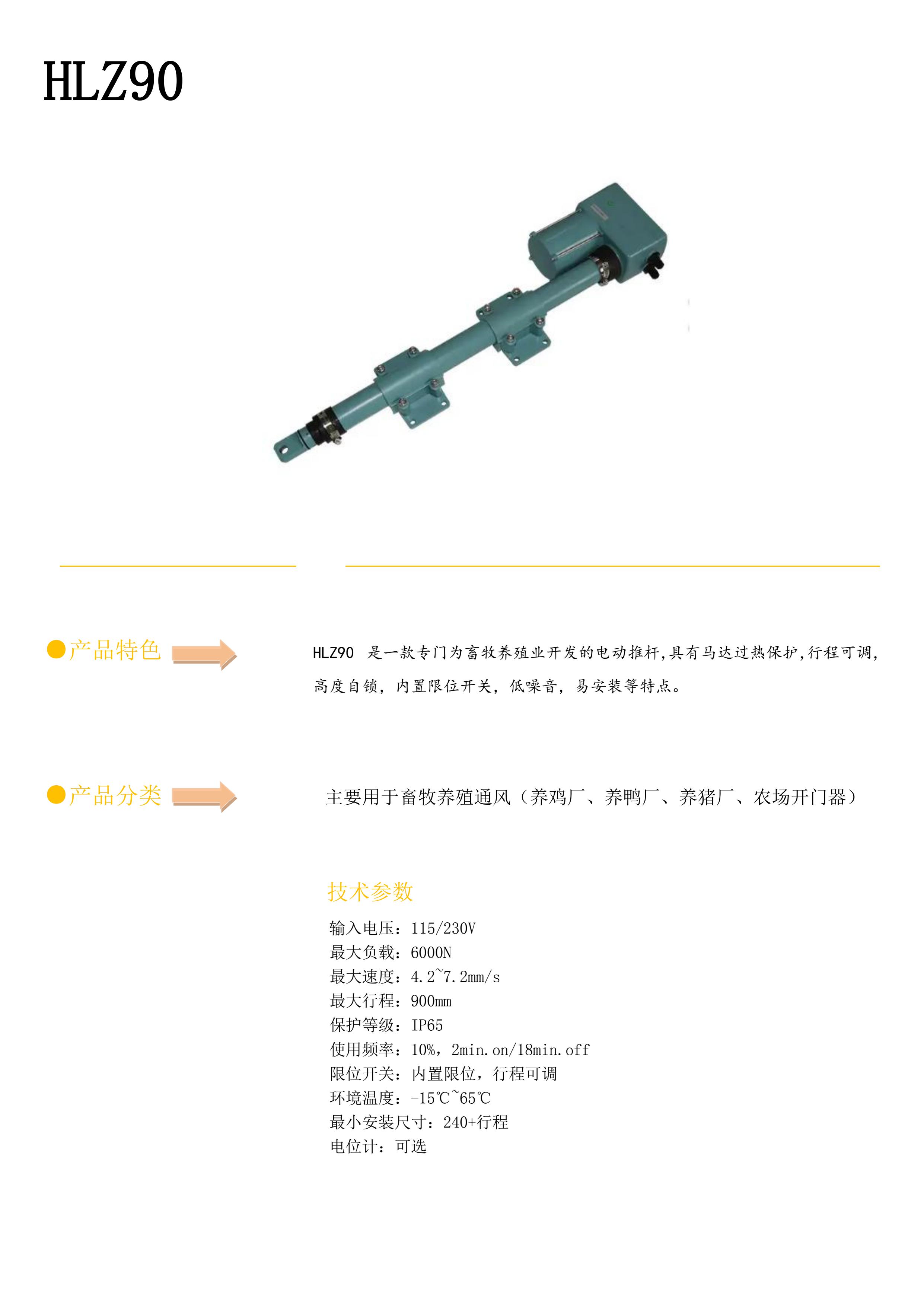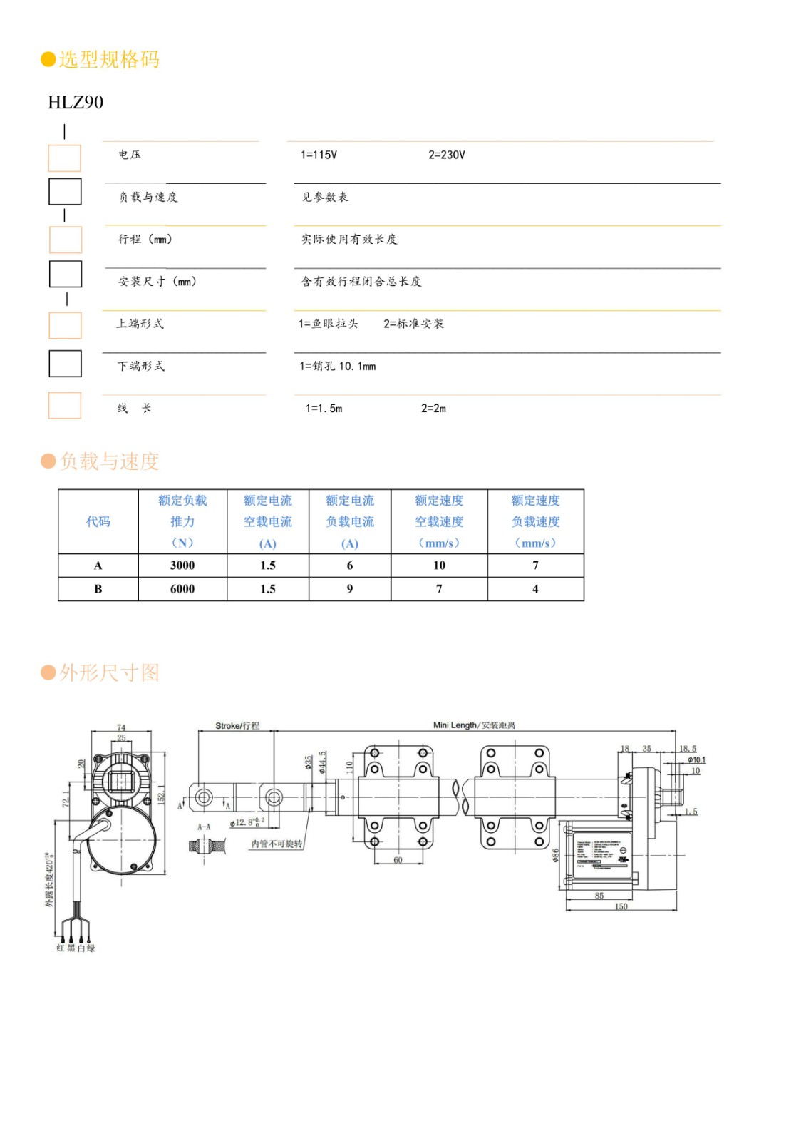 选型规格码 HLZ90 ______________________ ____________________________________________________________ 电压 1=115V 2=230V ________________________ ____________________________________________________________ 负载与速度 见参数表 ________________________ ____________________________________________________________ 行程(mm) 实际使用有效长度 ________________________ ____________________________________________________________ 安装尺寸(mm) 含有效行程闭合总长度 _______________________ ____________________________________________________________ 上端形式 1=鱼眼拉头 2=标准安装 _______________________ ____________________________________________________________ 下端形式 1=销孔 10.1mm _______________________ ____________________________________________________________ 线 长 1=1.5m 2=2m