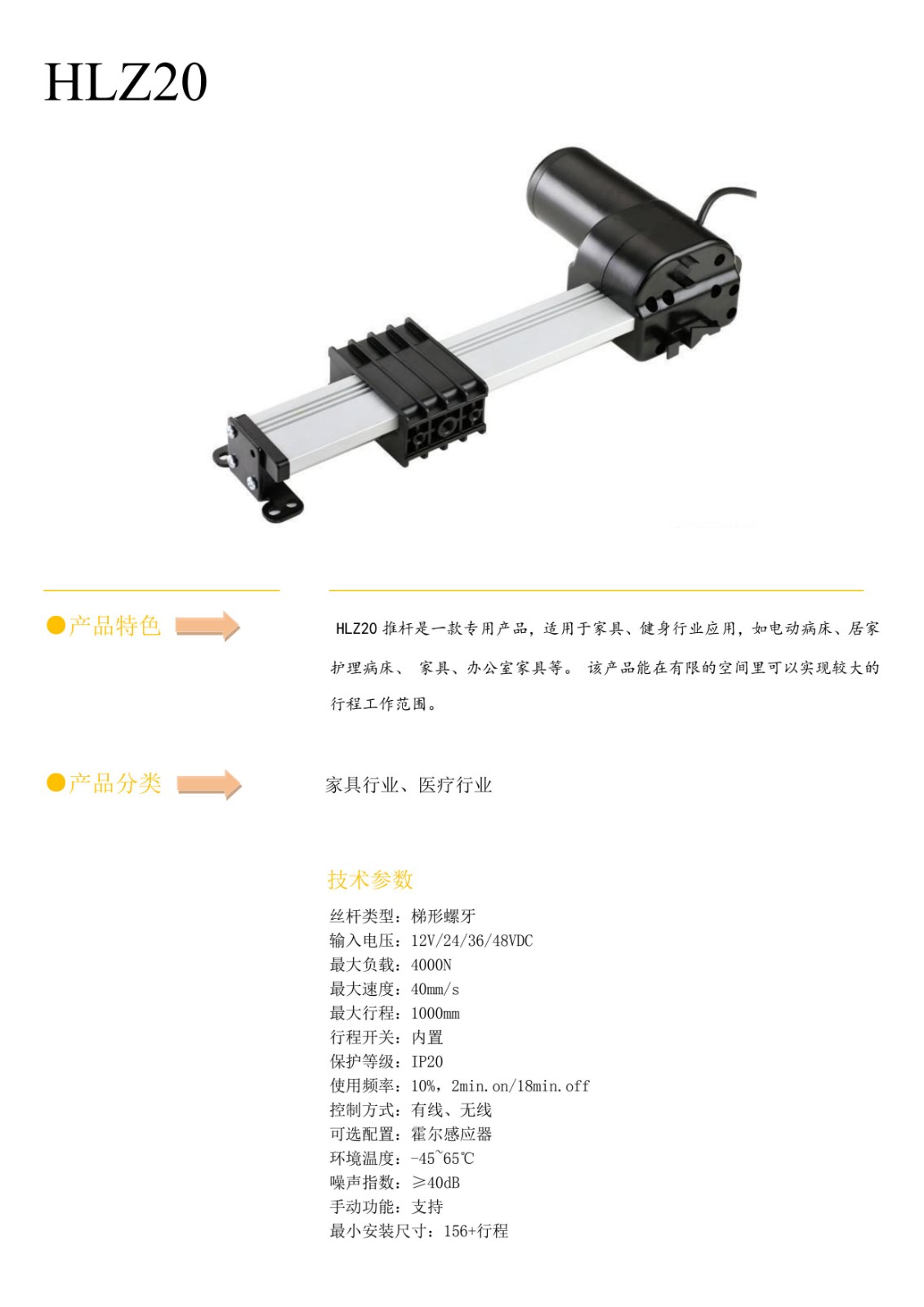 HLZ20推杆是一款专用产品,适用于家具、健身行业应用,如电动病床、居家护理病床、 家具、办公室家具等。 该产品能在有限的空间里可以实现较大的行程工作范围。