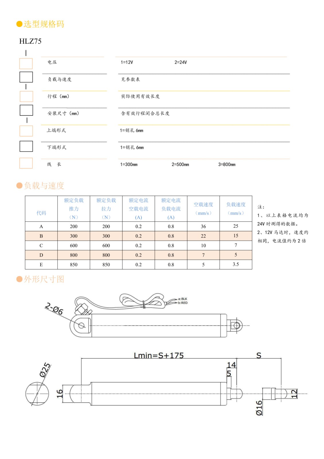 选型规格码 HLZ75 ______________________ ____________________________________________________________ 电压 1=12V 2=24V ________________________ ____________________________________________________________ 负载与速度 见参数表 ________________________ ____________________________________________________________ 行程(mm) 实际使用有效长度 ________________________ ____________________________________________________________ 安装尺寸(mm) 含有效行程闭合总长度 _______________________ ____________________________________________________________ 上端形式 1=销孔 6mm _______________________ ____________________________________________________________ 下端形式 1=销孔 6mm _______________________ ____________________________________________________________ 线 长 1=300mm 2=500mm 3=80mm