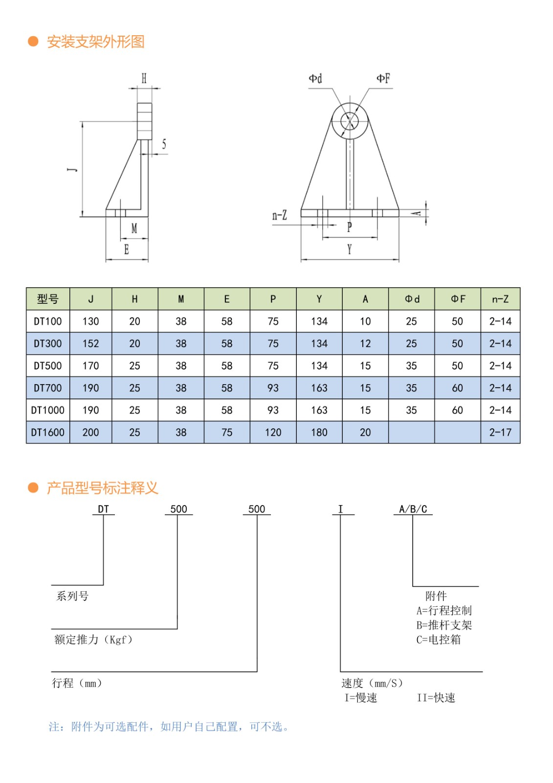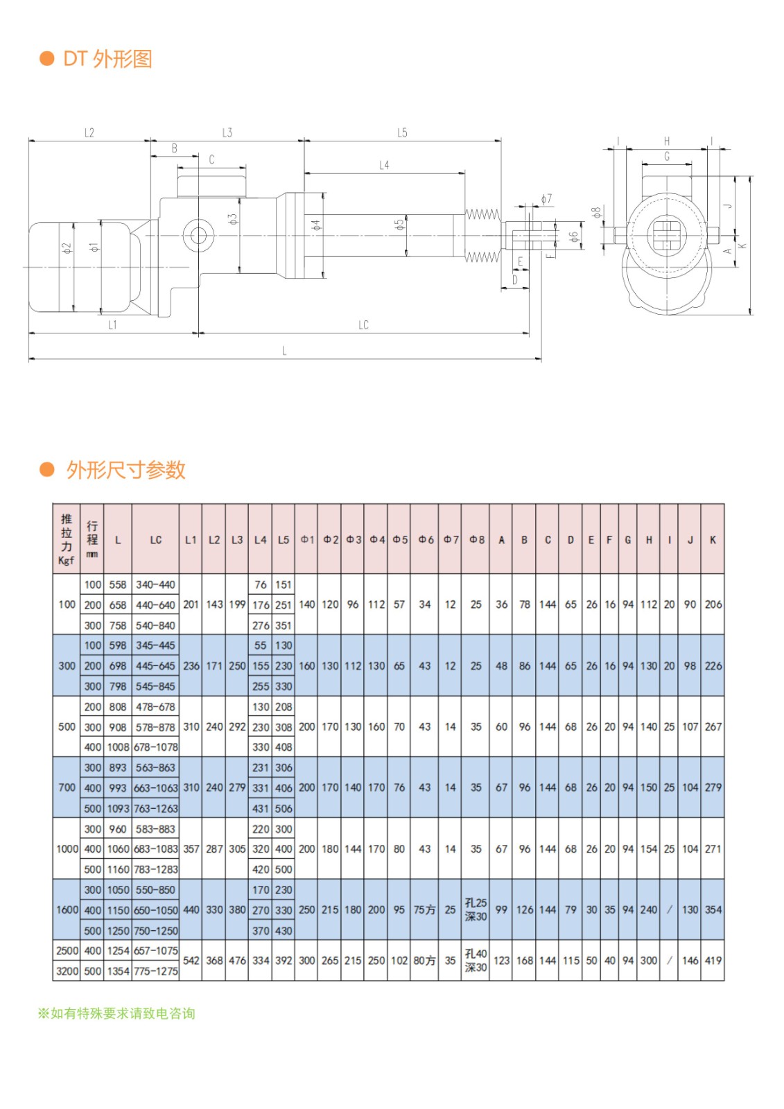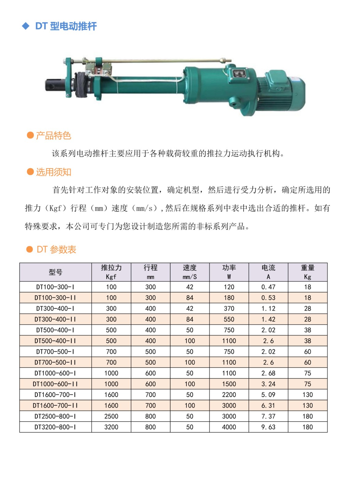 首先针对工作对象的安装位置,确定机型,然后进行受力分析,确定所选用的推力(Kgf)行程(mm)速度(mm/s),然后在规格系列中表中选出合适的推杆。如有特殊要求,本公司可专门为您设计制造您所需的非标系列产品。