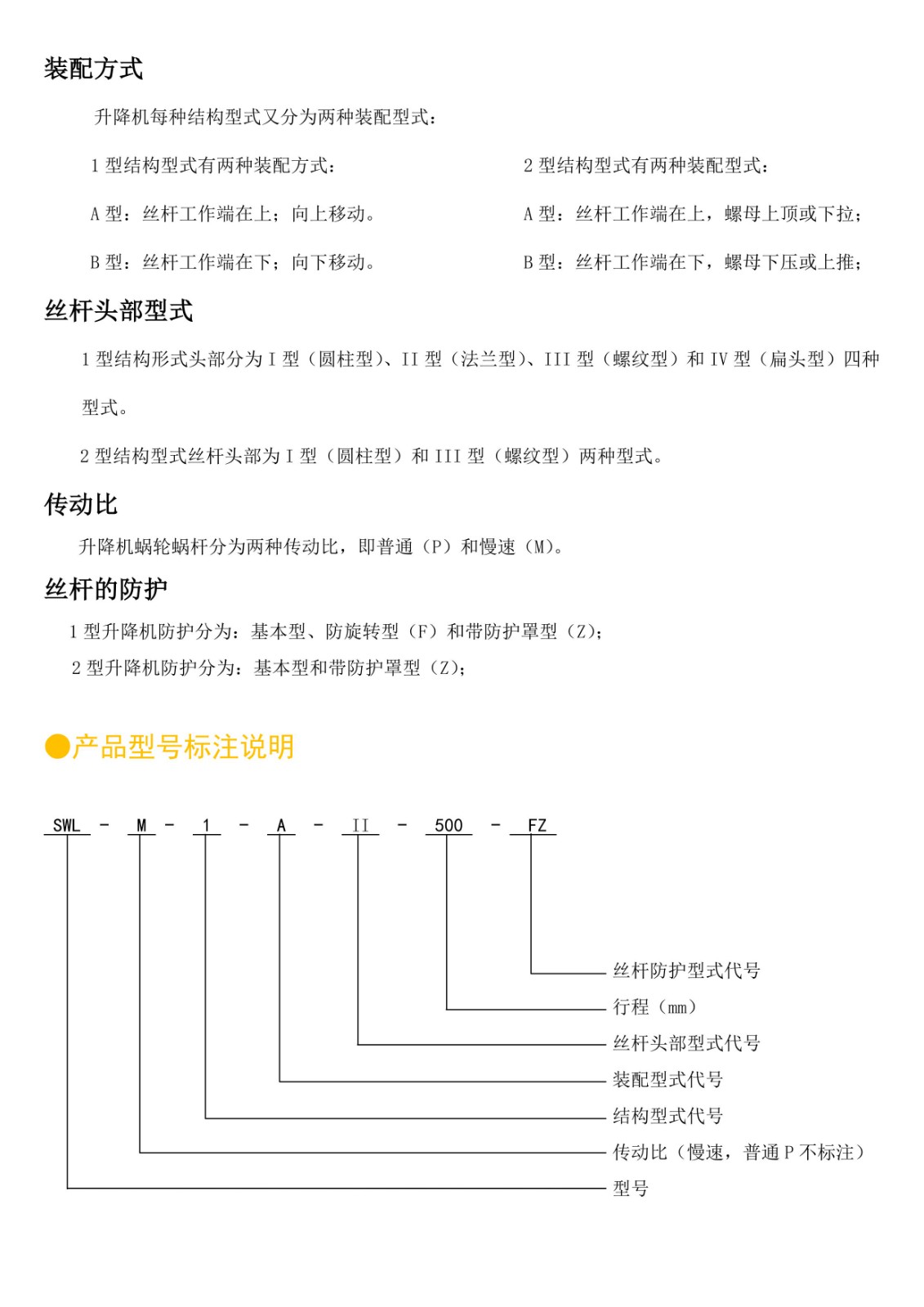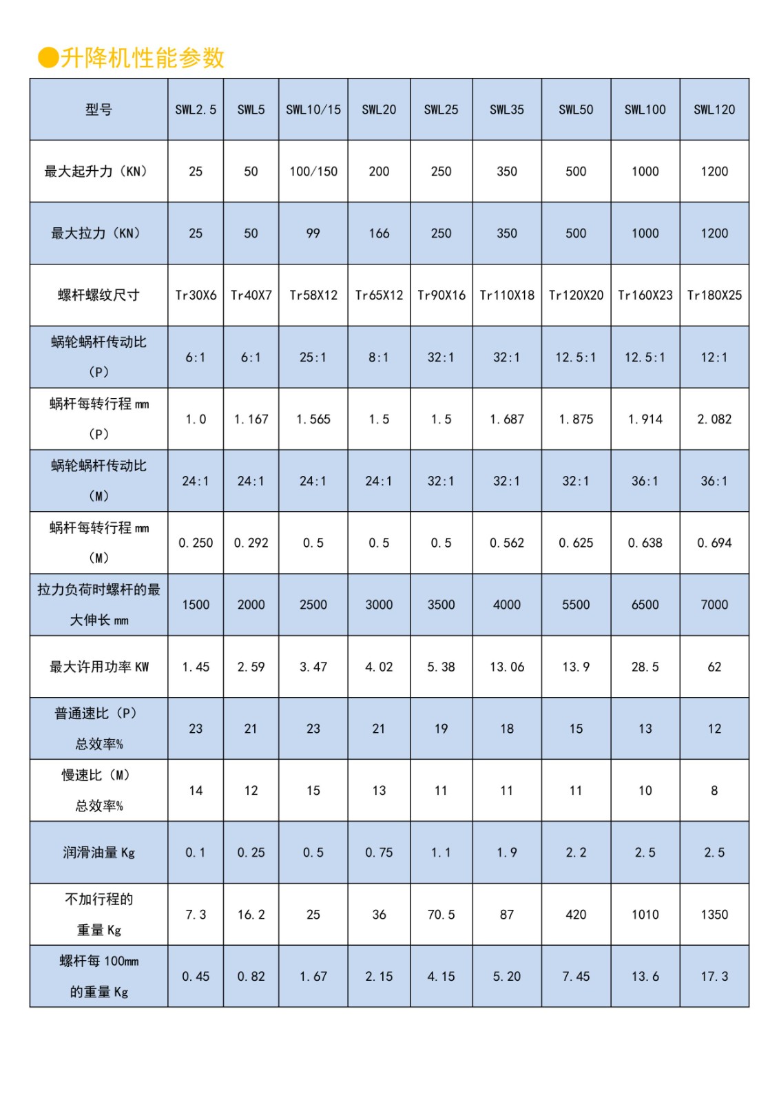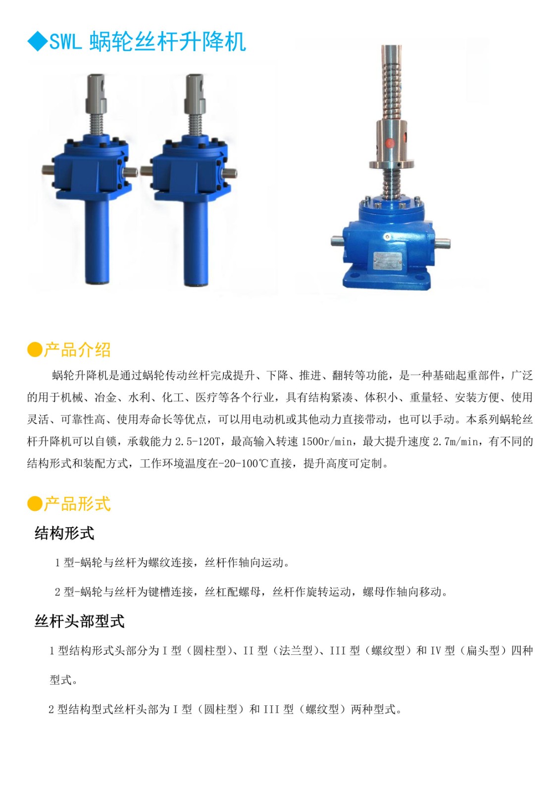 蜗轮升降机是通过蜗轮传动丝杆完成提升、下降、推进、翻转等功能,是一种基础起重部件,广泛的用于机械、冶金、水利、化工、医疗等各个行业,具有结构紧凑、体积小、重量轻、安装方便、使用灵活、可靠性高、使用寿命长等优点,可以用电动机或其他动力直接带动,也可以手动。本系列蜗轮丝杆升降机可以自锁,承载能力2.5-120T,最高输入转速1500r/min,最大提升速度2.7m/min,有不同的结构形式和装配方式,工作环境温度在-20-100℃直接,提升高度可定制。
