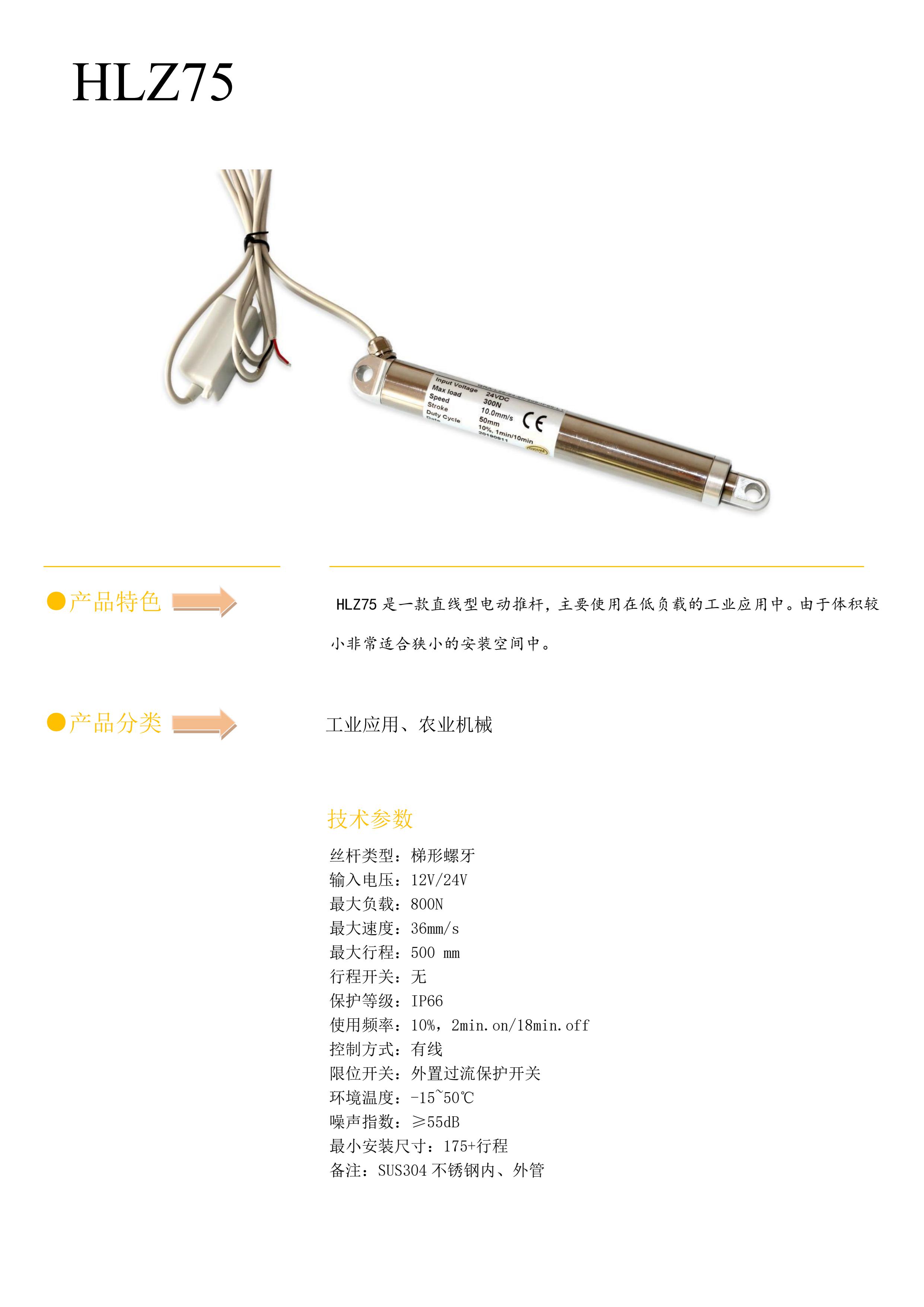 选型规格码 HLZ75 ______________________ ____________________________________________________________ 电压 1=12V 2=24V ________________________ ____________________________________________________________ 负载与速度 见参数表 ________________________ ____________________________________________________________ 行程(mm) 实际使用有效长度 ________________________ ____________________________________________________________ 安装尺寸(mm) 含有效行程闭合总长度 _______________________ ____________________________________________________________ 上端形式 1=销孔 6mm _______________________ ____________________________________________________________ 下端形式 1=销孔 6mm _______________________ ____________________________________________________________ 线 长 1=300mm 2=500mm 3=80mm