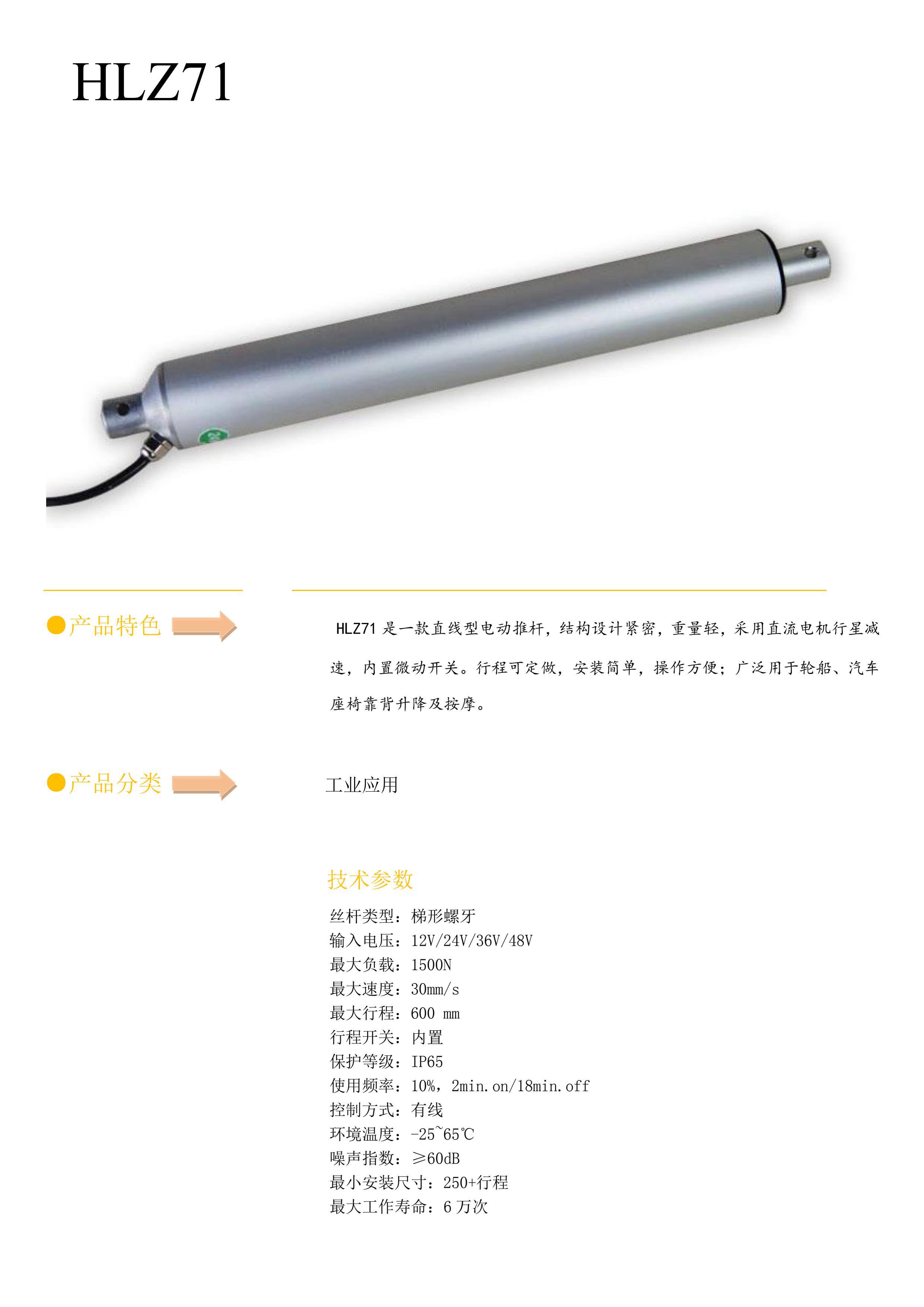 技术参数 丝杆类型:梯形螺牙 输入电压:12V/24V/36V/48V 最大负载:1500N 最大速度:30mm/s 最大行程:600 mm 行程开关:内置 保护等级:IP65 使用频率:10%,2min.on/18min.off 控制方式:有线 环境温度:-25~65℃ 噪声指数:≥60dB 最小安装尺寸:250+行程 最大工作寿命:6 万次●选型规格码 HLZ71 ______________________ ____________________________________________________________ 电压 1=12V 2=24V 3=36V 4=48V ________________________ ____________________________________________________________ 负载与速度 见参数表 ________________________ ____________________________________________________________ 行程(mm) 实际使用有效长度 ________________________ ____________________________________________________________ 安装尺寸(mm) 含有效行程闭合总长度 _______________________ ____________________________________________________________ 上端形式 1=销孔 6mm 2=U 型开槽 3=鱼眼拉头 _______________________ ____________________________________________________________ 下端形式 1=销孔 6mm _______________________ ____________________________________________________________ 限位开关 1=两端点开关切电流 2=两端点开关信号输出 _______________________ ____________________________________________________________ 线 长 1=300mm 2=500mm 3=800mm