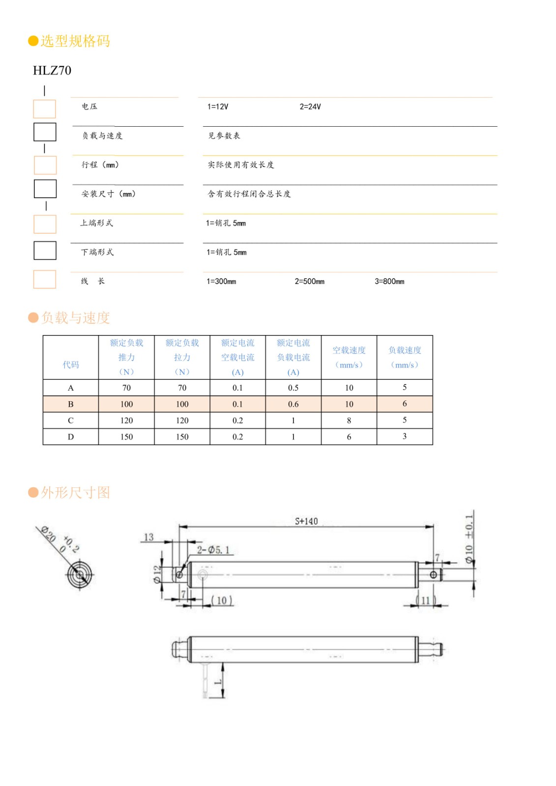 技术参数 丝杆类型:梯形螺牙 输入电压:12V/24V 最大负载:150N 最大速度:10mm/s 最大行程:500 mm 行程开关:无 保护等级:IP65 使用频率:10%,2min.on/18min.off 控制方式:有线 限位开关:内置 环境温度:-15~50℃ 噪声指数:≥55dB 最小安装尺寸:140+行程●选型规格码 HLZ70 ______________________ ____________________________________________________________ 电压 1=12V 2=24V ________________________ ____________________________________________________________ 负载与速度 见参数表 ________________________ ____________________________________________________________ 行程(mm) 实际使用有效长度 ________________________ ____________________________________________________________ 安装尺寸(mm) 含有效行程闭合总长度 _______________________ ____________________________________________________________ 上端形式 1=销孔 5mm _______________________ ____________________________________________________________ 下端形式 1=销孔 5mm _______________________ ____________________________________________________________ 线 长 1=300mm 2=500mm 3=800mm